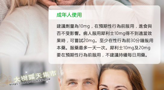 1. 房事前使用:建議在性行為前30分鐘至1小時服用,標準劑量為10mg,根據個人需求和效果調整至20mg。每日最大劑量為20mg。