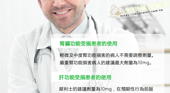 • 肝功能不全患者:建議劑量為10mg。重度肝功能不全者(Child-Pugh分級C)應謹慎使用,需由醫生進行利益/風險評估。